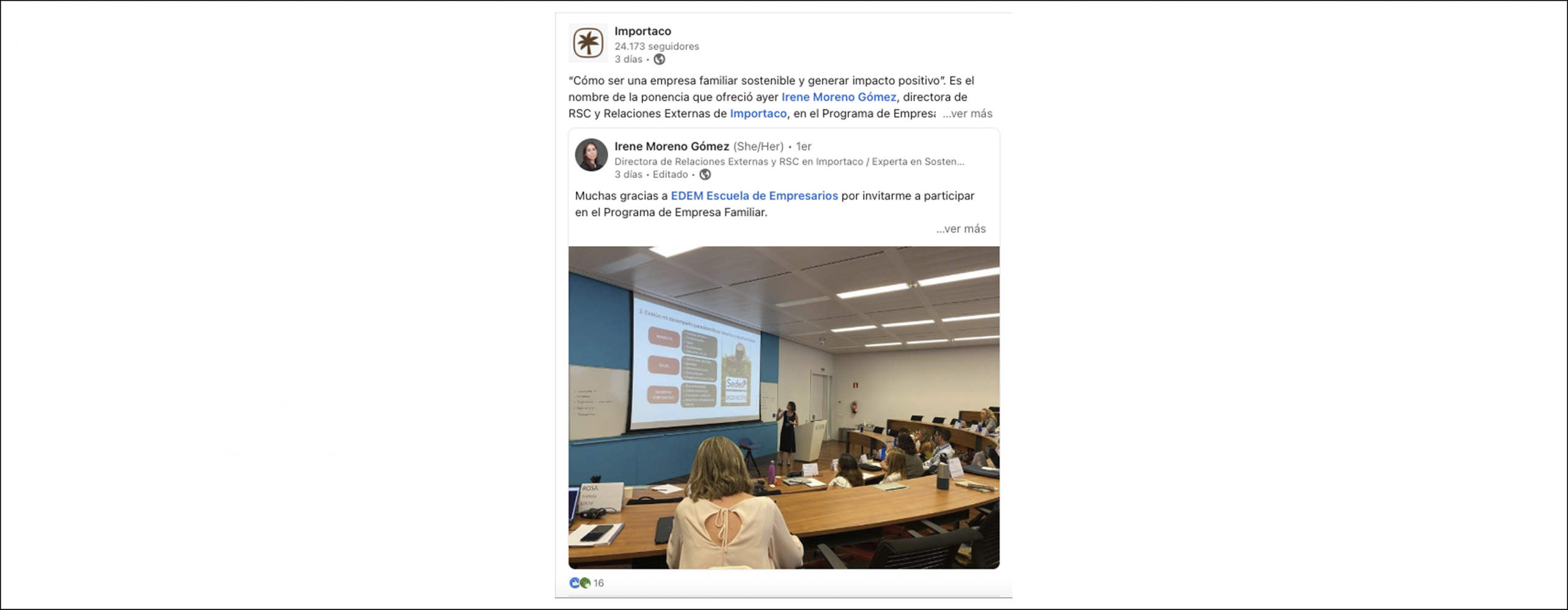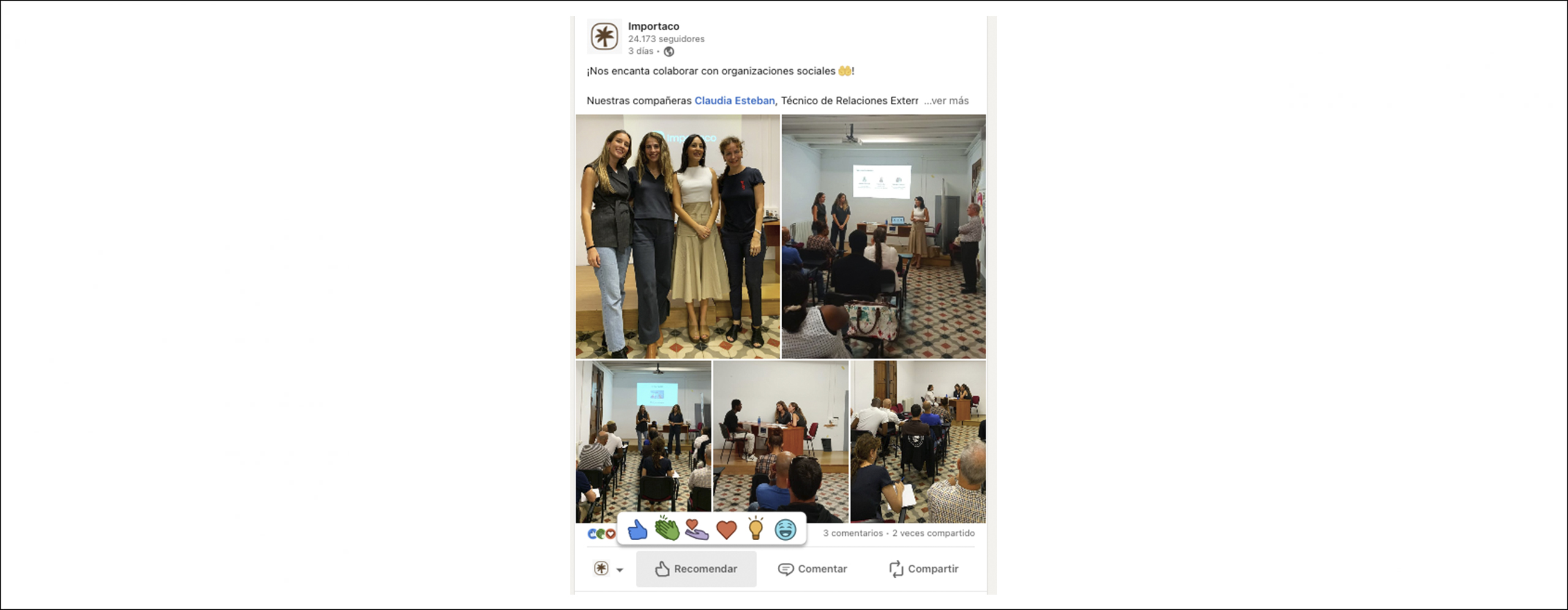 Forma parte de las tipologías de reacciones ante una publicación. Se trata de compartir un contenido de una tercera persona u organización con tu comunidad, fruto del interés que te ha generado. Puedes hacerlo de dos formas, añadiendo un comentario propio o directamente.