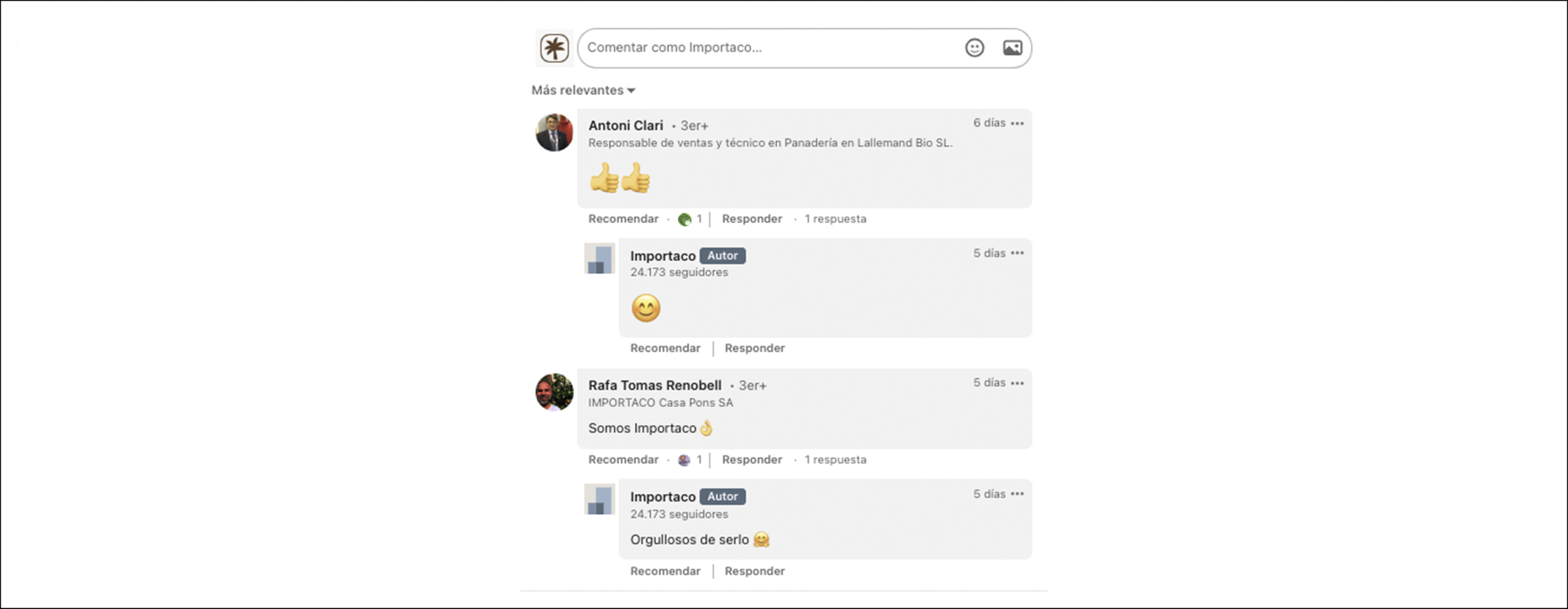 Cualquier publicación puede recibir comentarios de otras personas u organizaciones. El espacio para realizarlo es la caja situada justo debajo de cada publicación. Los comentarios se pueden ordenar por cronología o por relevancia, siendo estos la interacción más valorada por el algoritmo de LinkedIn, y su acumulación dota de relevancia a la publicación. Además, los comentarios entre miembros del mismo equipo son una buena praxis.